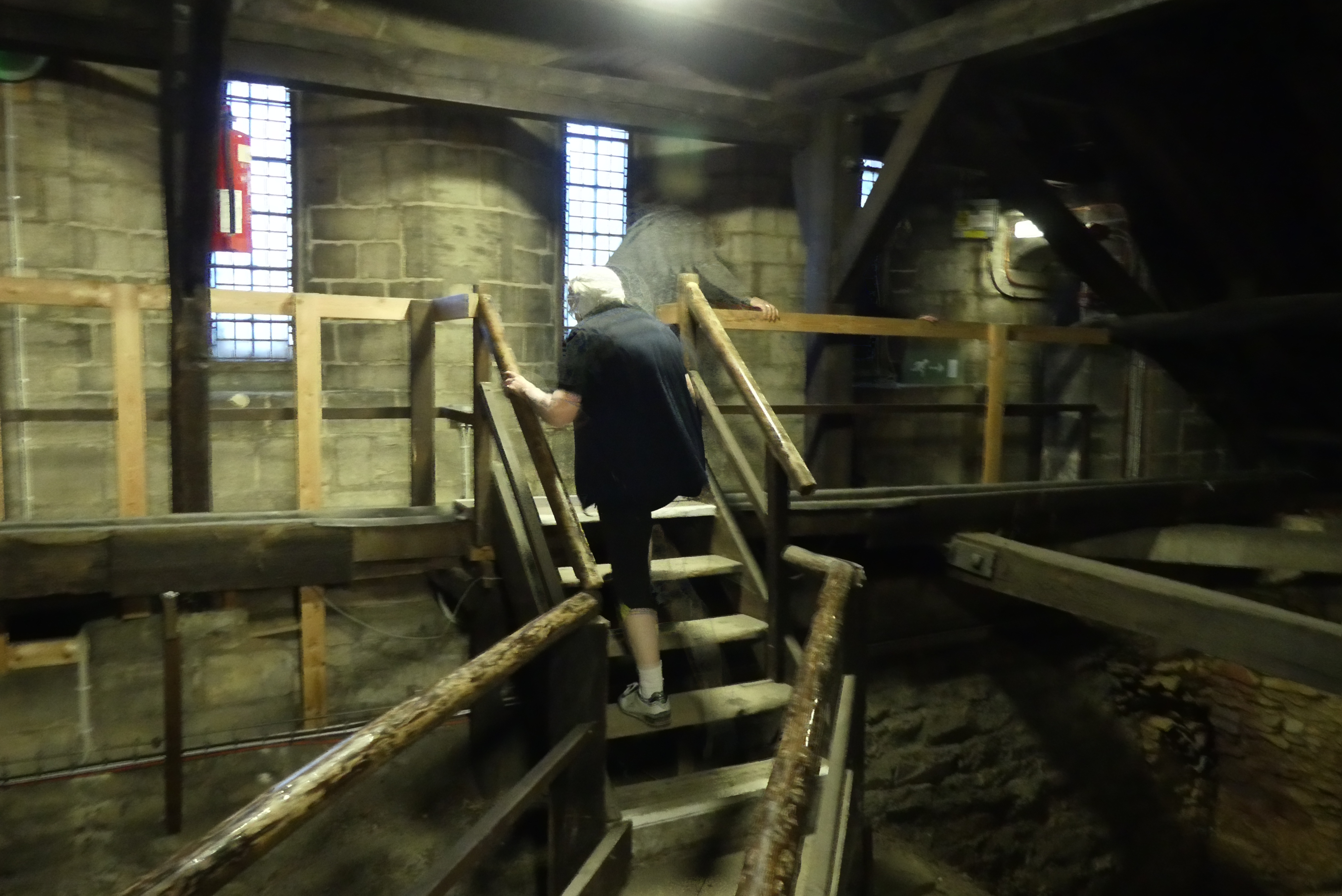 It is over 100 steps to the ringing room but the stairway is wide with a good hand-rail so it was quite an easy climb. The last part is a walk on a wooden platform over a vaulted ceiling and then into a passage which surrounds the ringing room. Twelve ropes, tidy ringing circle and a tenor of 21cwt.