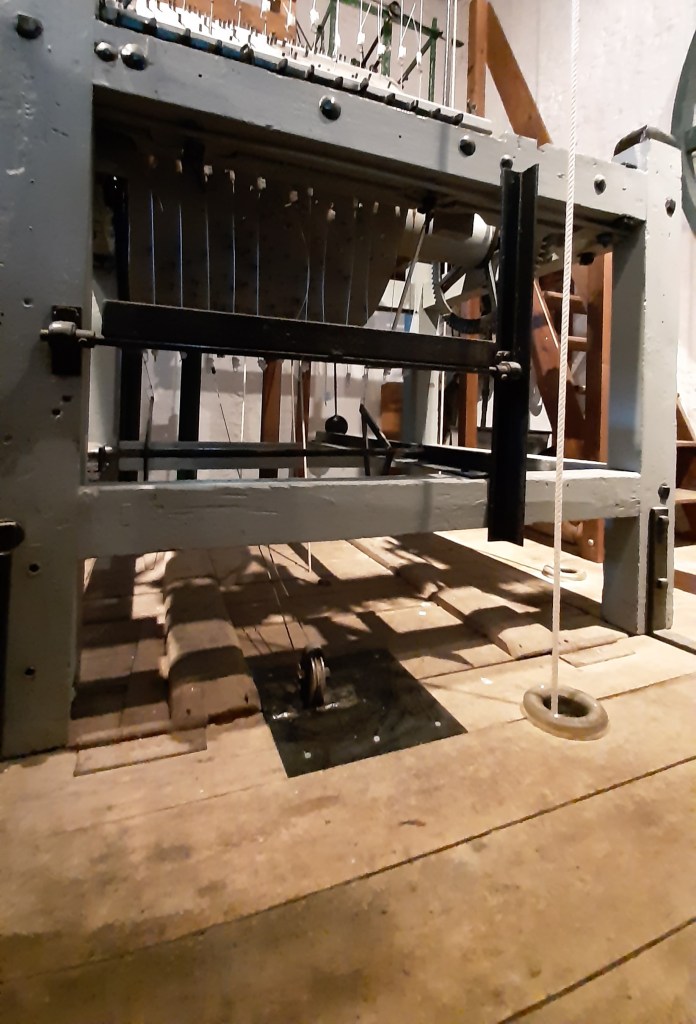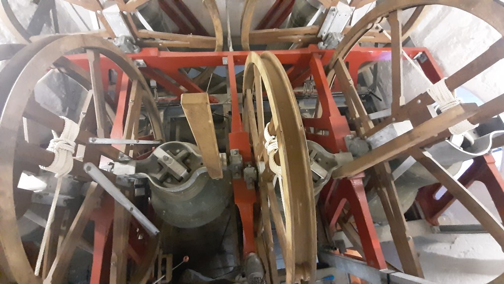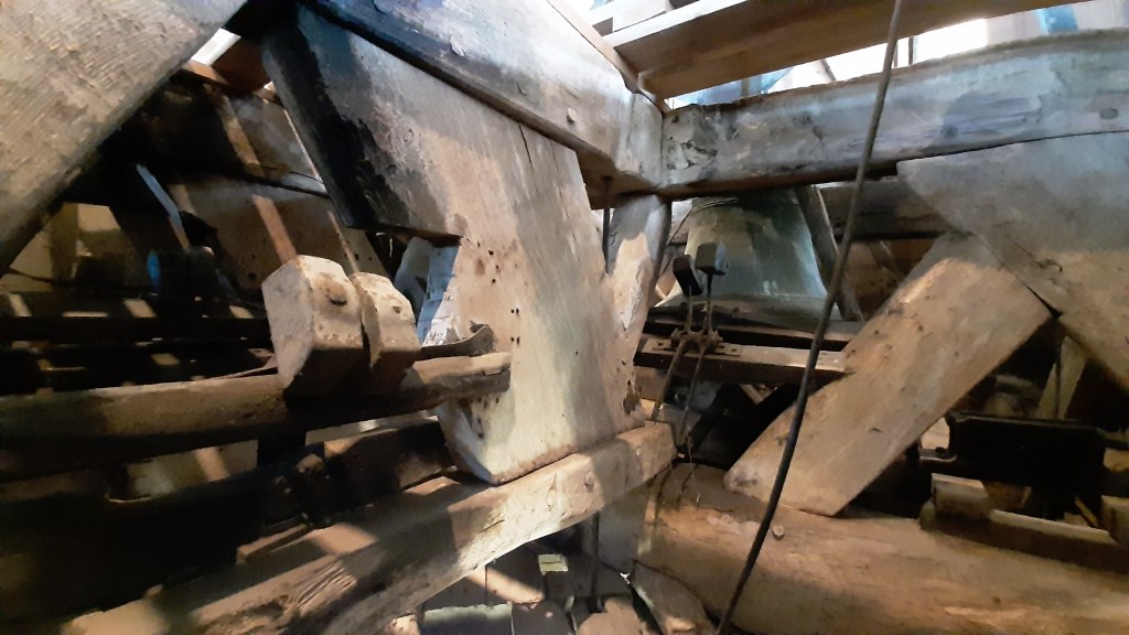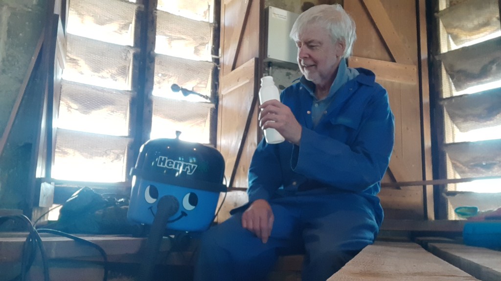 I always start at the top of the tower in the old belfry which involves squeezing inside the old bell frame accompanied by Henry which works continuously as we move from bell-pit to bell-pit. This area takes about four hours and then we move down to the new belfry which is a slightly easier environment to access. This is two hour stint making sure that the bell frame is swept and the floor vaccumed. The challenge here is stepping over the clock wires and again it helps to be a contortionist.