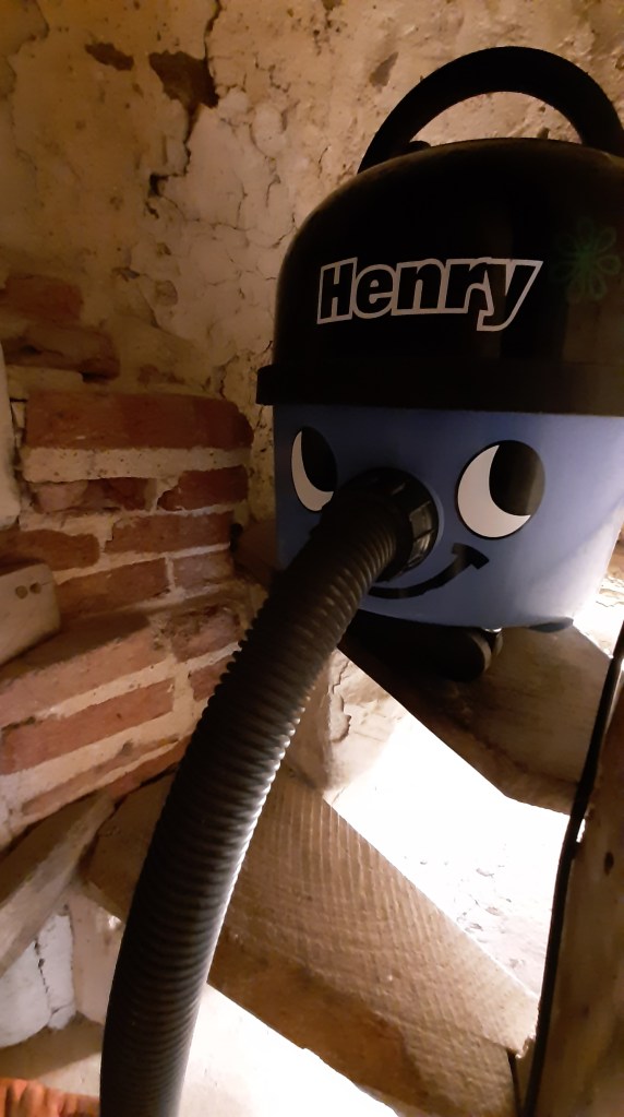 Then, down to the clock room. This is quite an easy room to clean and takes about an hour but there are still pinch-points to negotiate and of course Henry needs to be moved around and lifted into certain less accessible places.