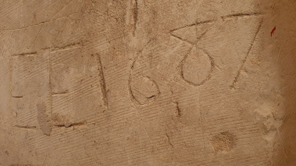 My photographs this year include some graffiti. It can be found in one of the window reveals in the sprial staircase and reads EE 1687. Who’s are these initials? They are possibly those of Edward Elwood. He was one of the churchwardens at that time. It is known that the tower was restored in 1686 and there is a lead plaque on the top of the tower with his and his co-churchwardens’ initials, NL (Nicholas Livett) with the same date. We also know from the churchwardens accounts of that time that Edward was a carpenter and did occasioanal work to repair the clock and the bells. We will never know for certain if it is his graffiti, albeit a year after the tower repairs, it is amongst many names and dates in the tower. Every time I visit I feel that I am walking through history!