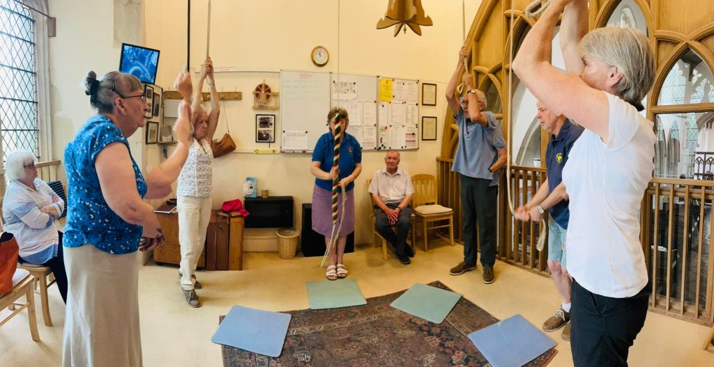 The photo shows some of the ringers, with resident tower captain Sheila ringing the treble (on the left).