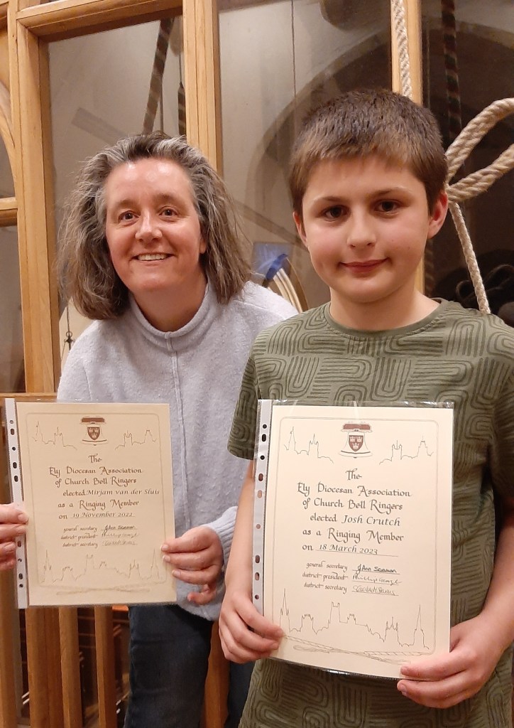During our practice on Thursday 30th March we proudly peresented membership certificates to Josh and Mirjam. Mirjam was elected as a member of the Ely Diocesan Association of Church Bell Ringers in November 2022 and Josh in March 2023.