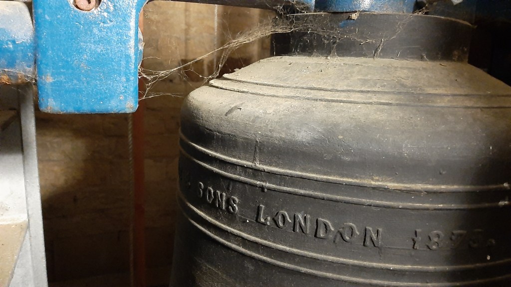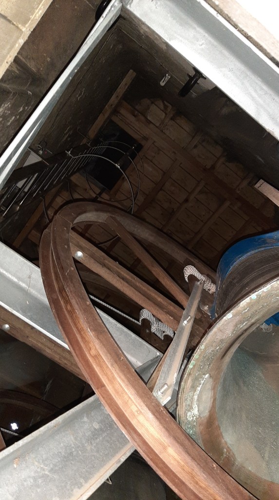 At the end of the practice we rang down in peal and Geoff invited us to see the bells, which most of us accepted. The bells are squeezed into the belfry in two tiers. As they are quite big bells there is not much space to manoever but we managed to admire the installation and take a few photos.