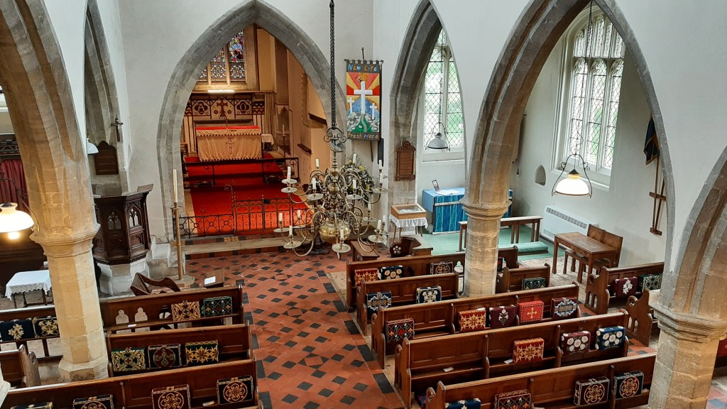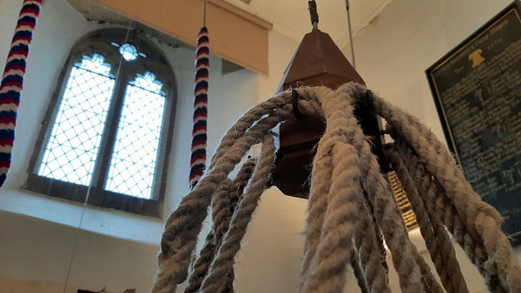 On to Oakley (6) 10cwt and the one handed clock, where access to the ringing room is by ladder. Lovely perpendicular window in the ringing room. Performance touch – Stedman 5