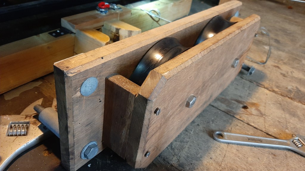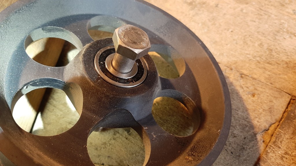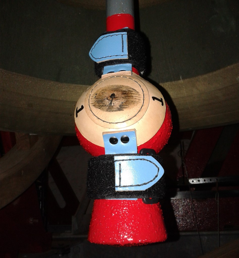 We are constantly inspecting the bell installation and recently identified some minor wear on one of the rollers on the ground pully of the tenor bell. This has been caused by 25 years of ringing, but is not excessive. It is a twin roller block and the roller showing wear is the backstroke one. This gets more rope contact than the handstroke and so is more susceptible to ‘grooving’.