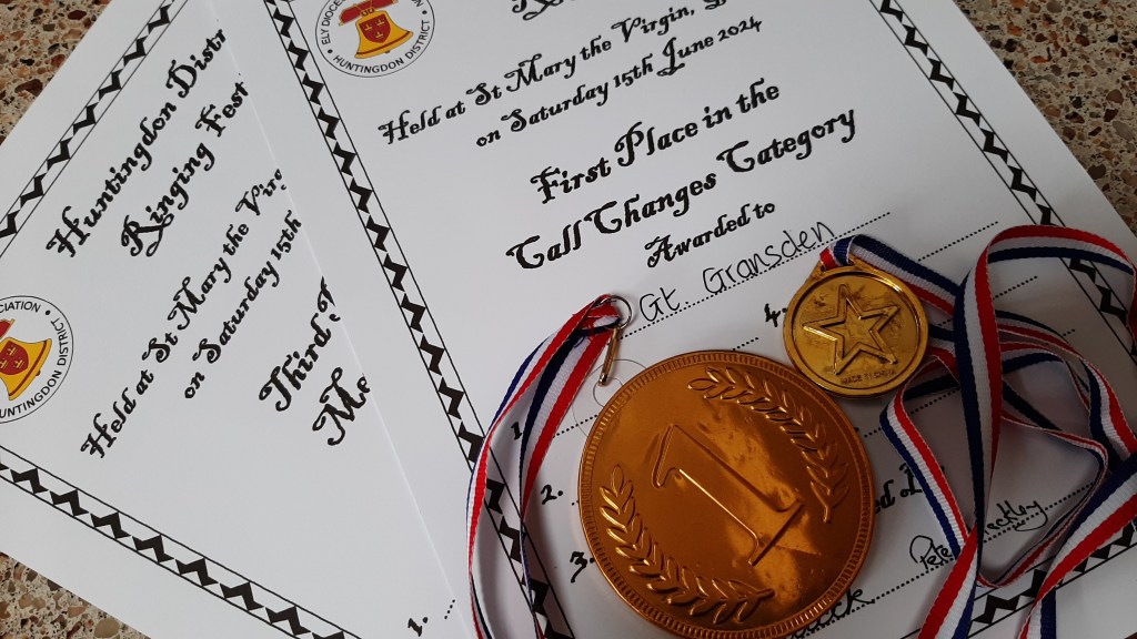 Today, Monday the 25th, Hazel rang her first QP inside, which was of Plain Bob Doubles, in her home tower – Gt Gransden. This is Hazel’s ninth QP, the others being on either the treble or tenor to doubles. https://bb.ringingworld.co.uk/view.php?id=1879974
