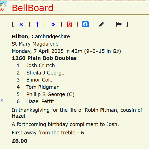 We had some vey nice ringing, thank you to the following ringers: Josh Crutch, Phillip George, Sheila George, Hazel Pettit, David Prest, Sheila Prest and Tricia Williams.